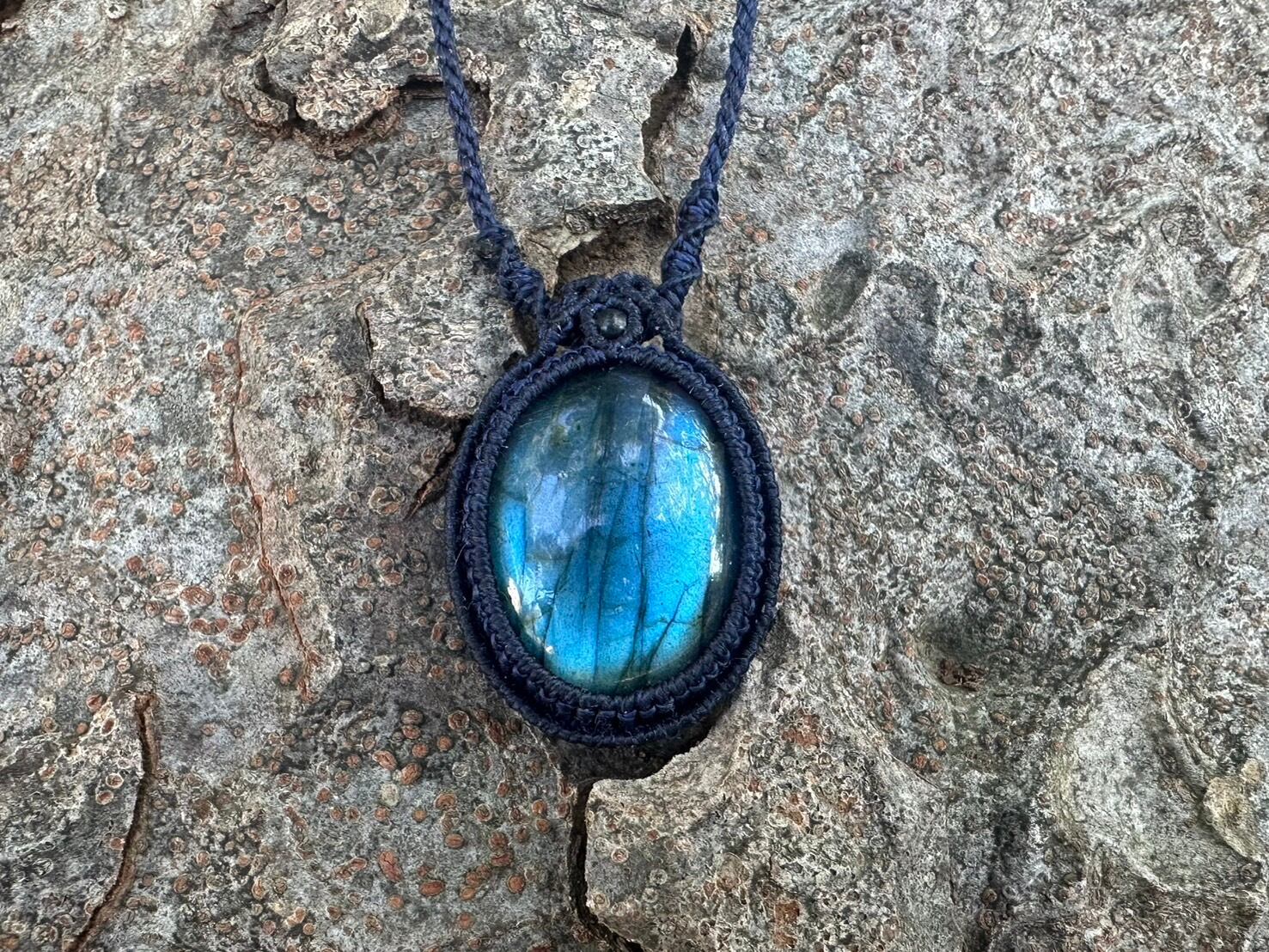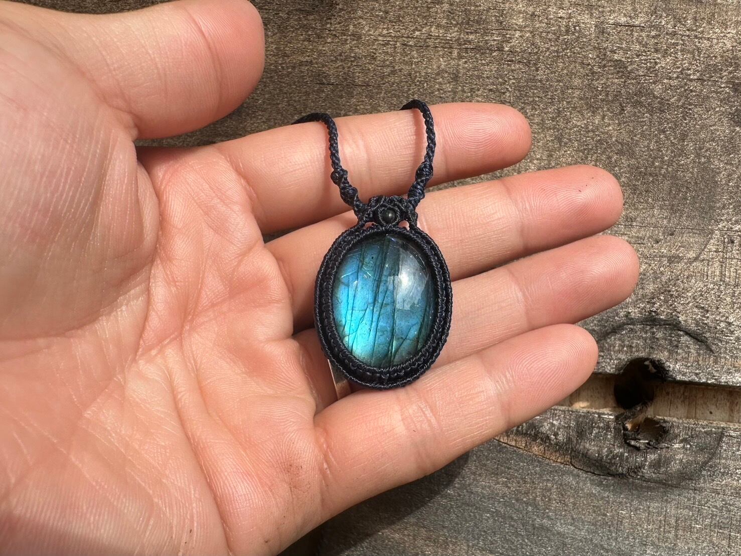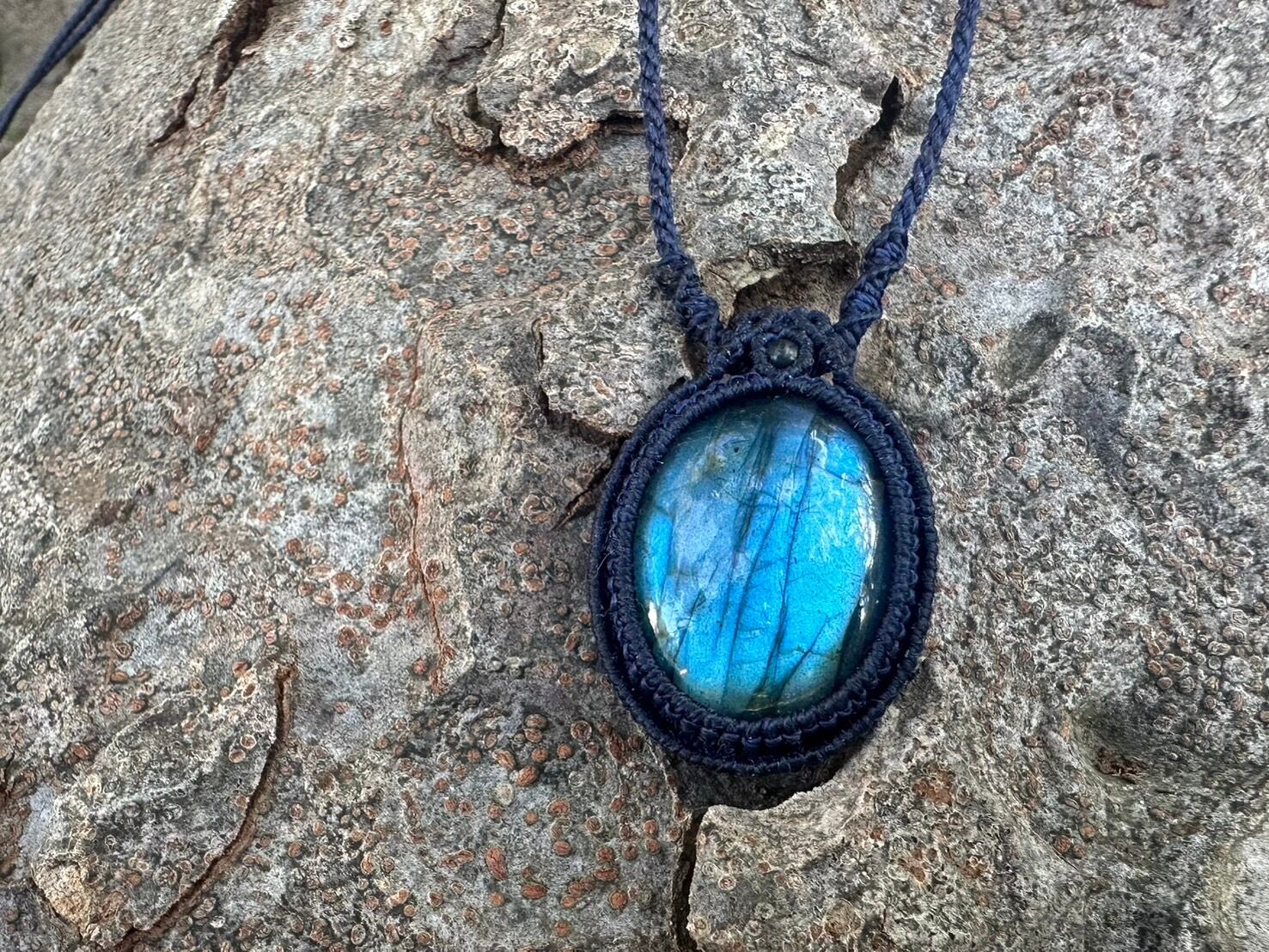 光の角度によって神秘的な青い輝きを放つラブラドライトを、丁寧なマクラメ編みで包み込んだネックレス。