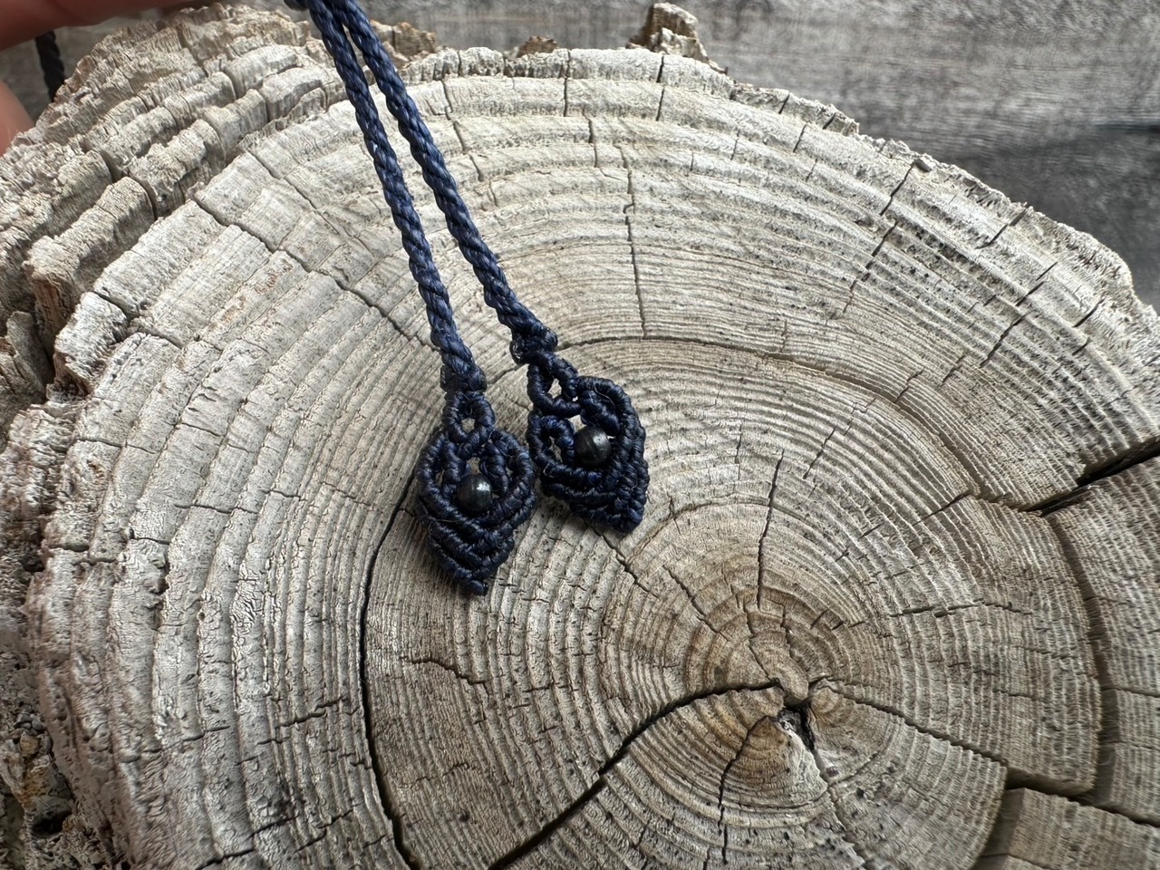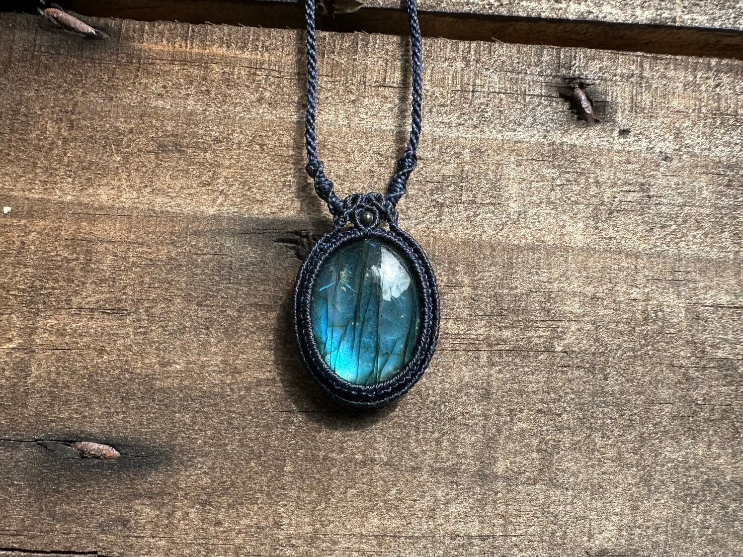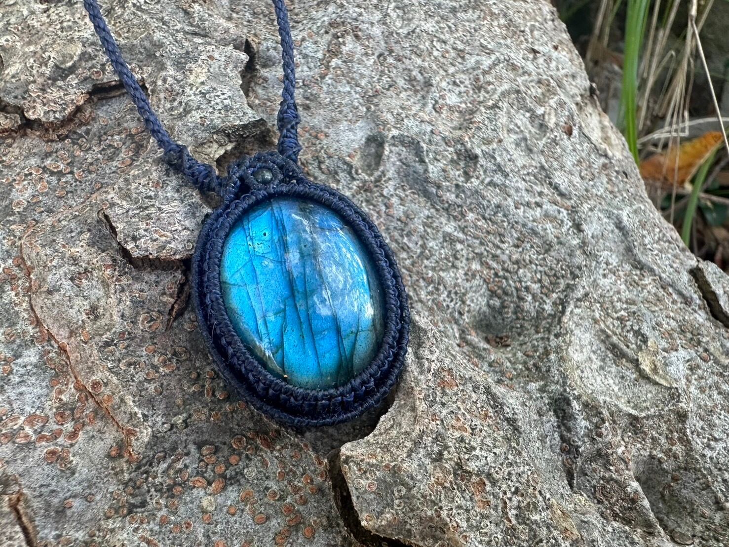 光の角度によって神秘的な青い輝きを放つラブラドライトを、丁寧なマクラメ編みで包み込んだネックレス。