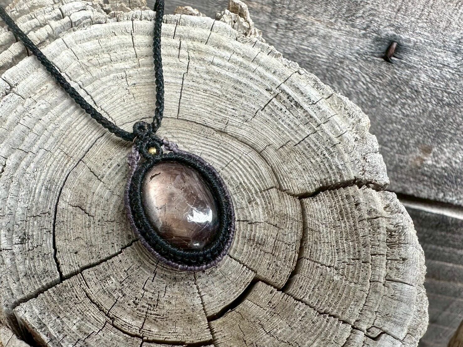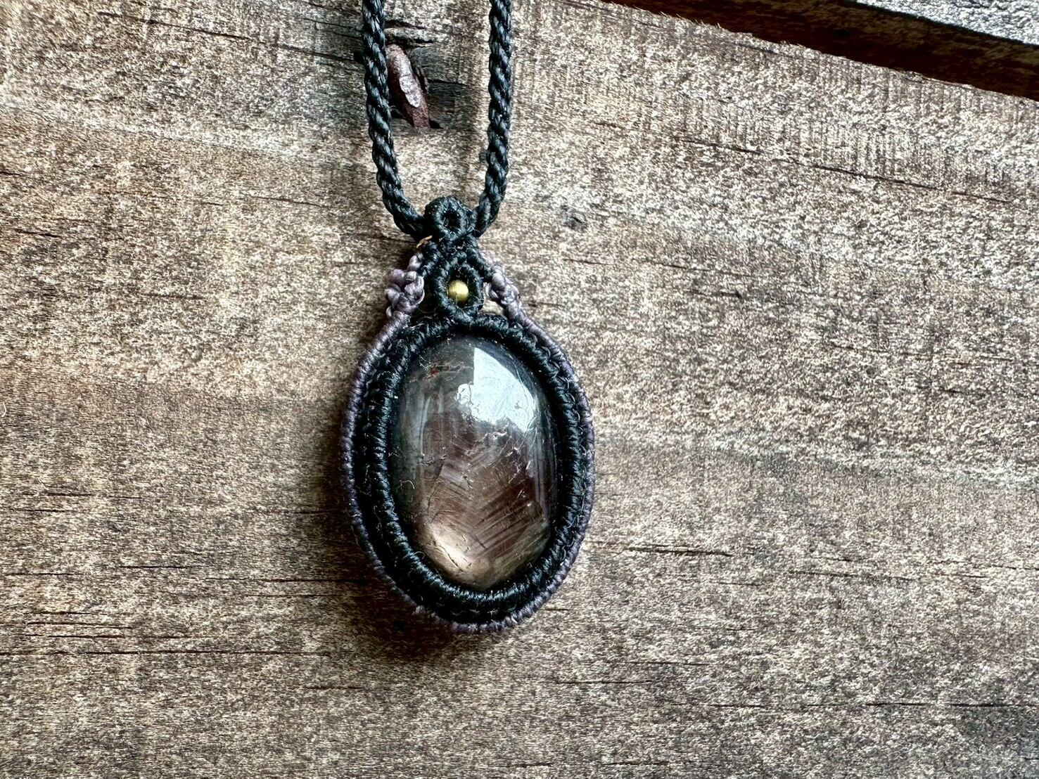 「ゴールデンシーンサファイア」の神秘的な光を引き立てるよう、シンプルながらも存在感のあるマクラメ編みで丁寧に仕上げました。