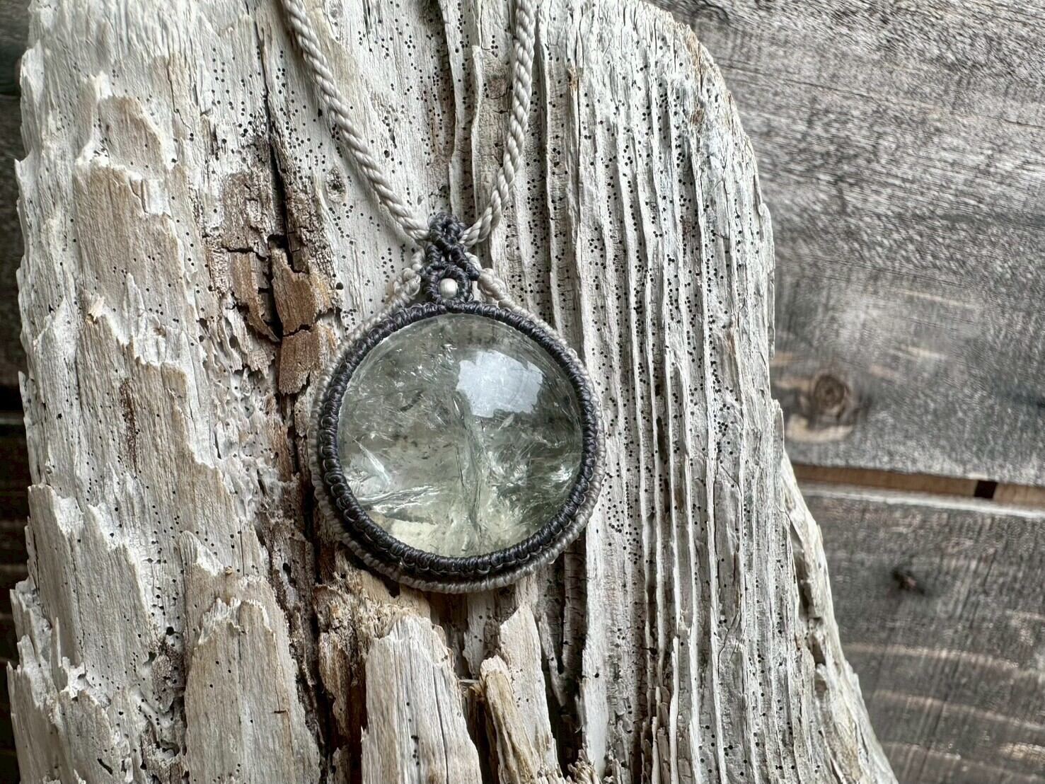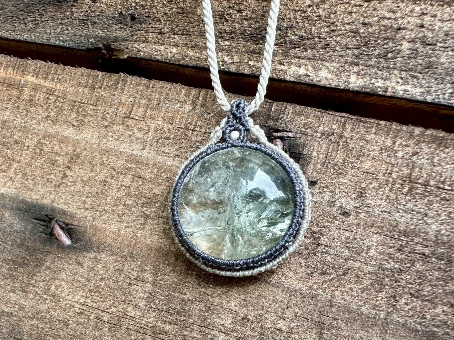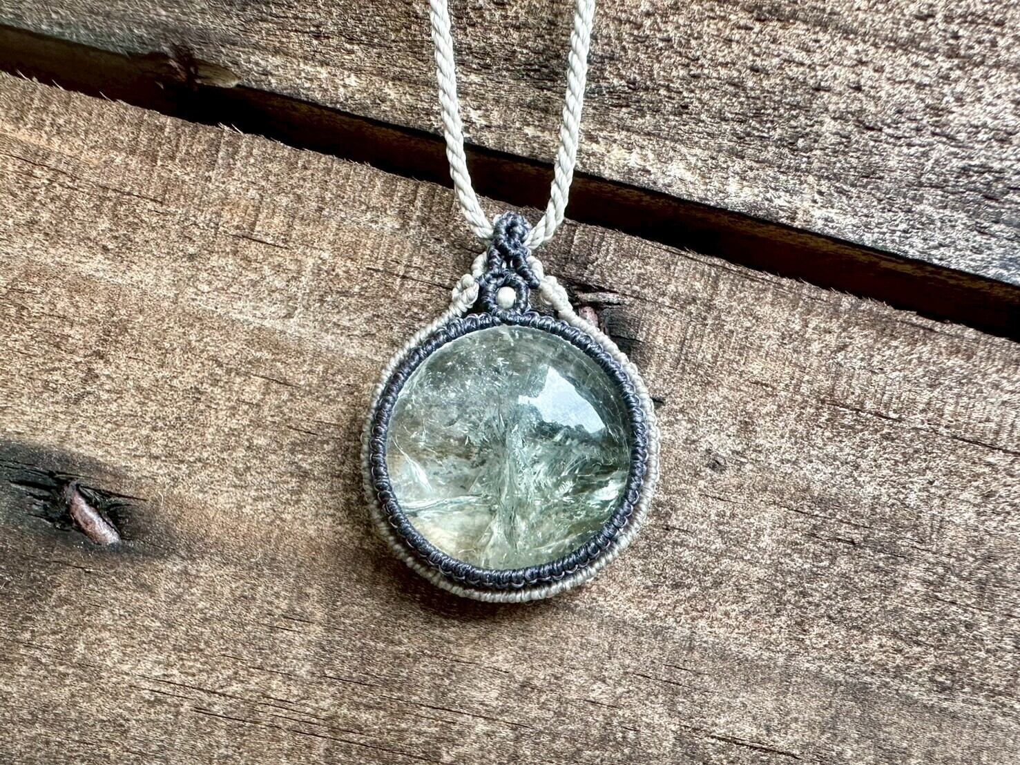大きめで存在感のあるグリーンアメジストを、優しい色合いの蝋引き紐で丁寧にマクラメ編みを施したネックレスです。