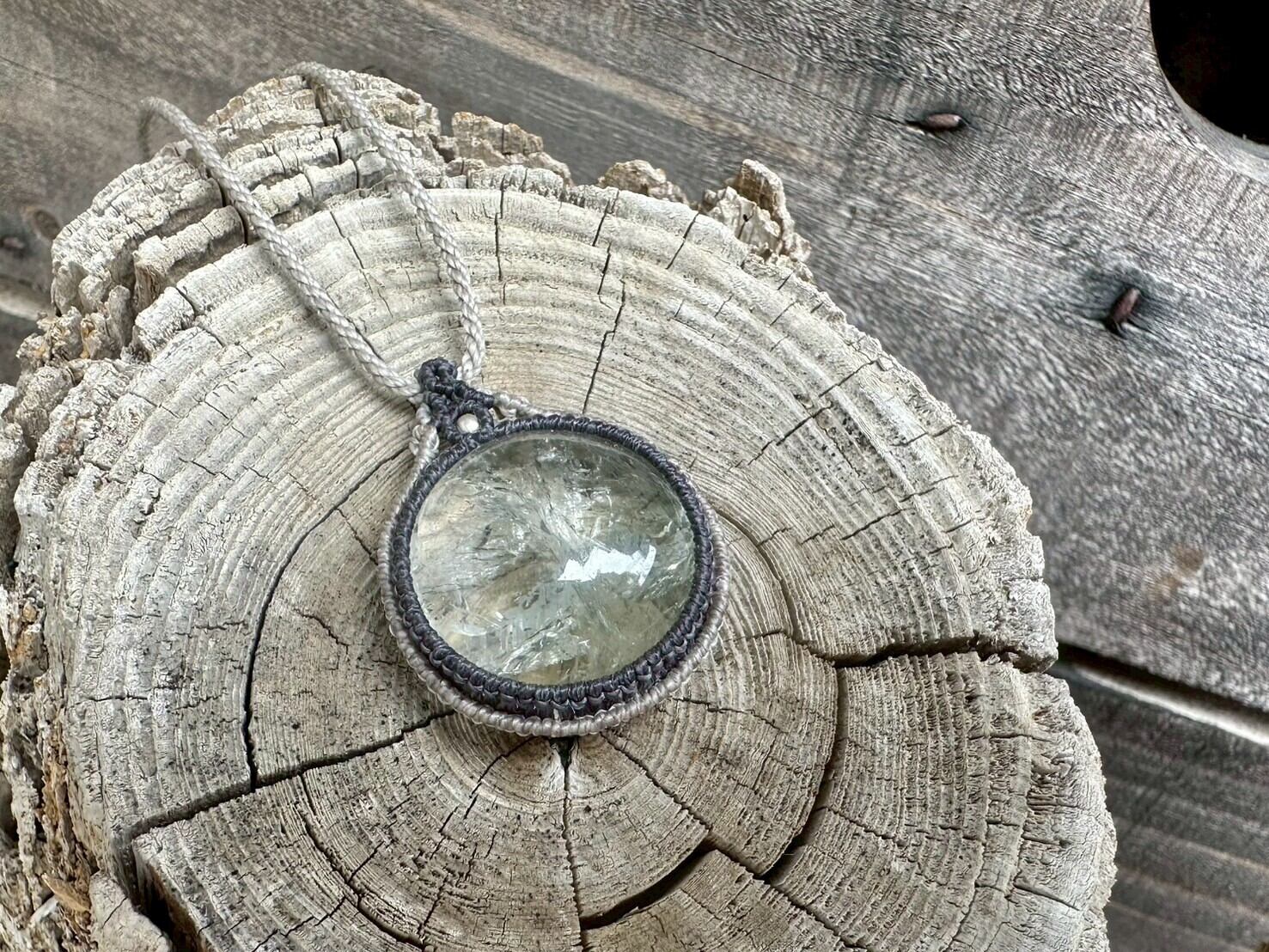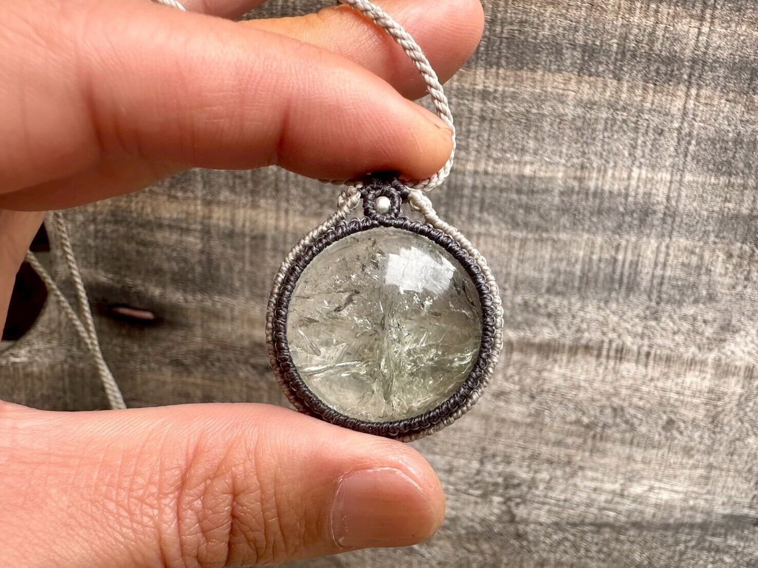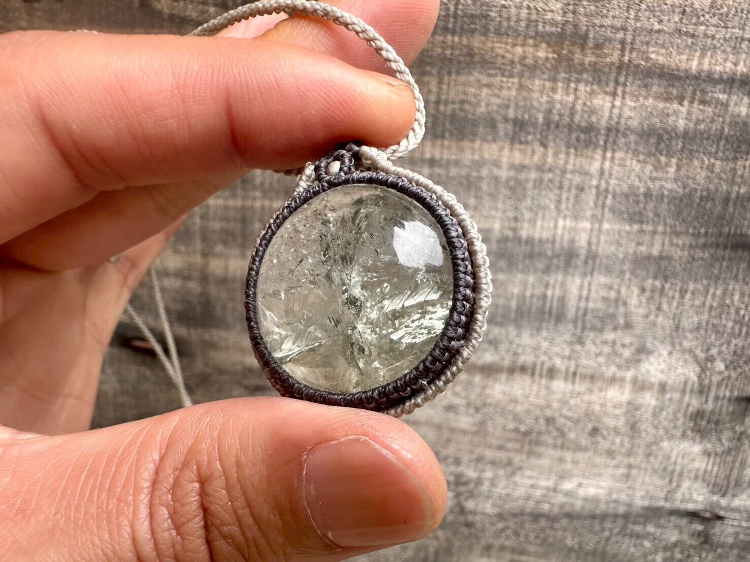 大きめで存在感のあるグリーンアメジストを、優しい色合いの蝋引き紐で丁寧にマクラメ編みを施したネックレスです。