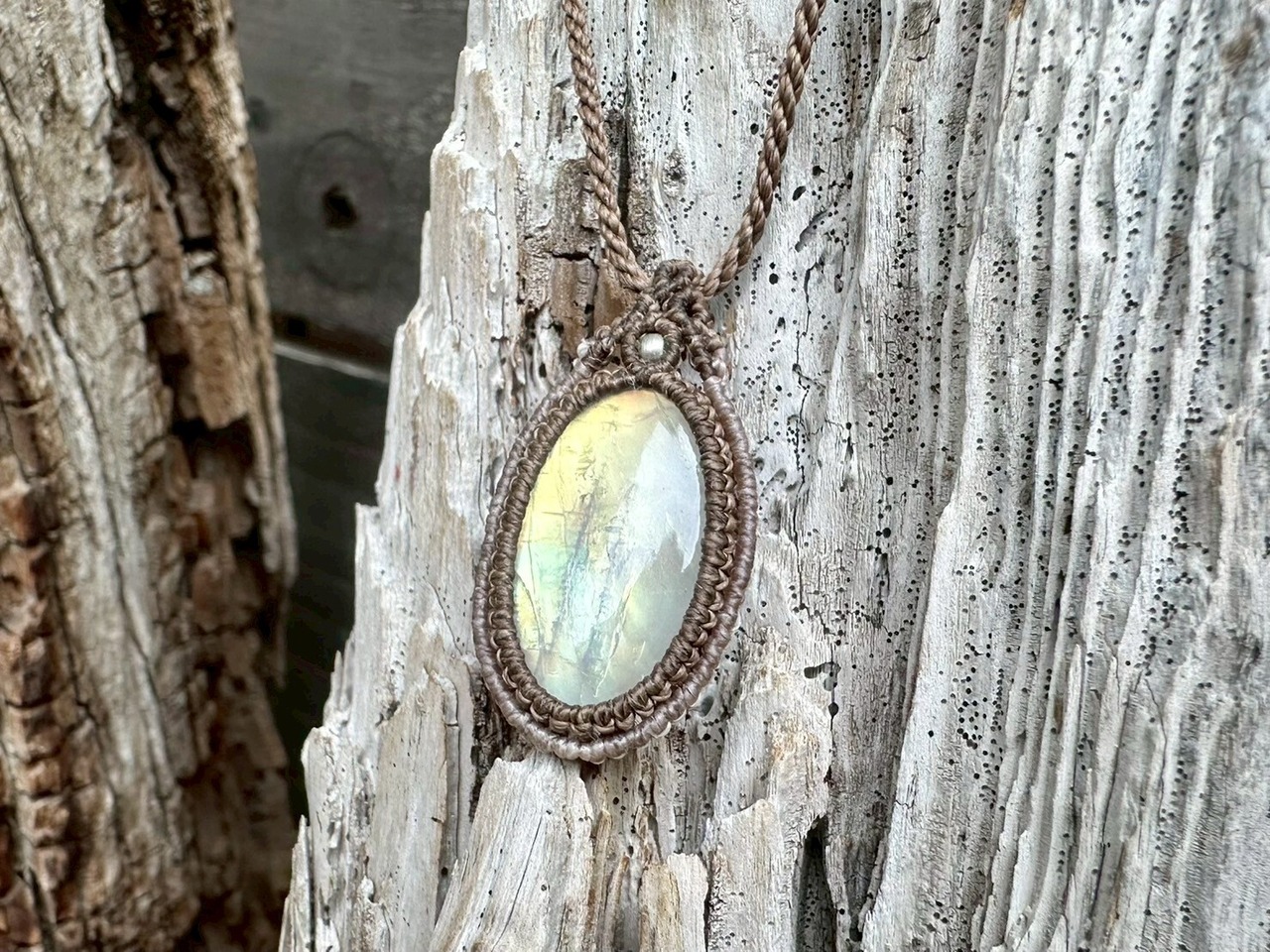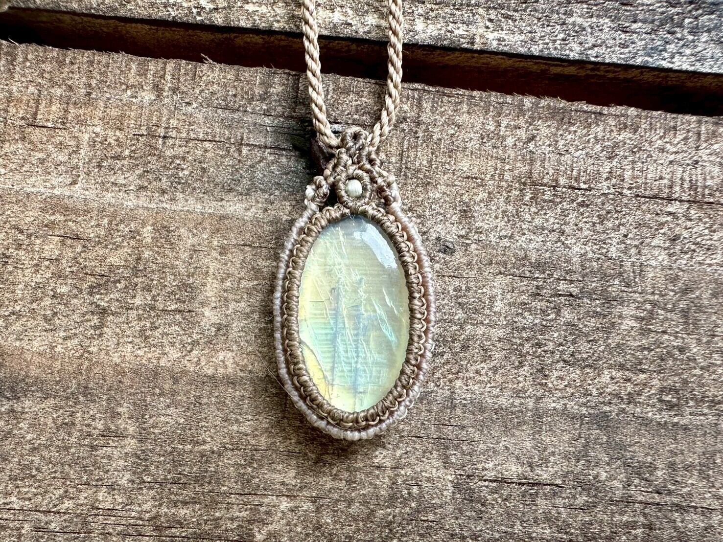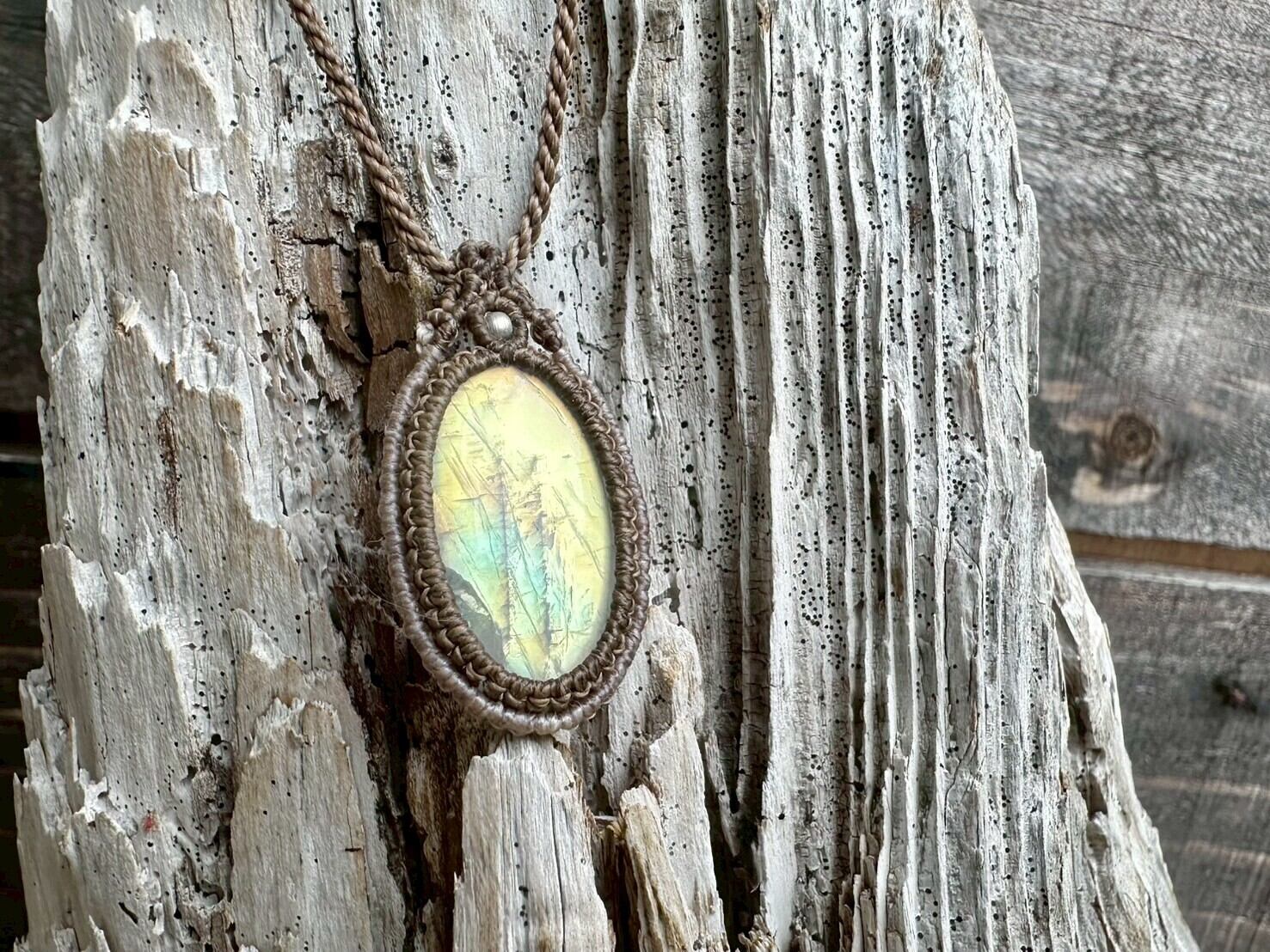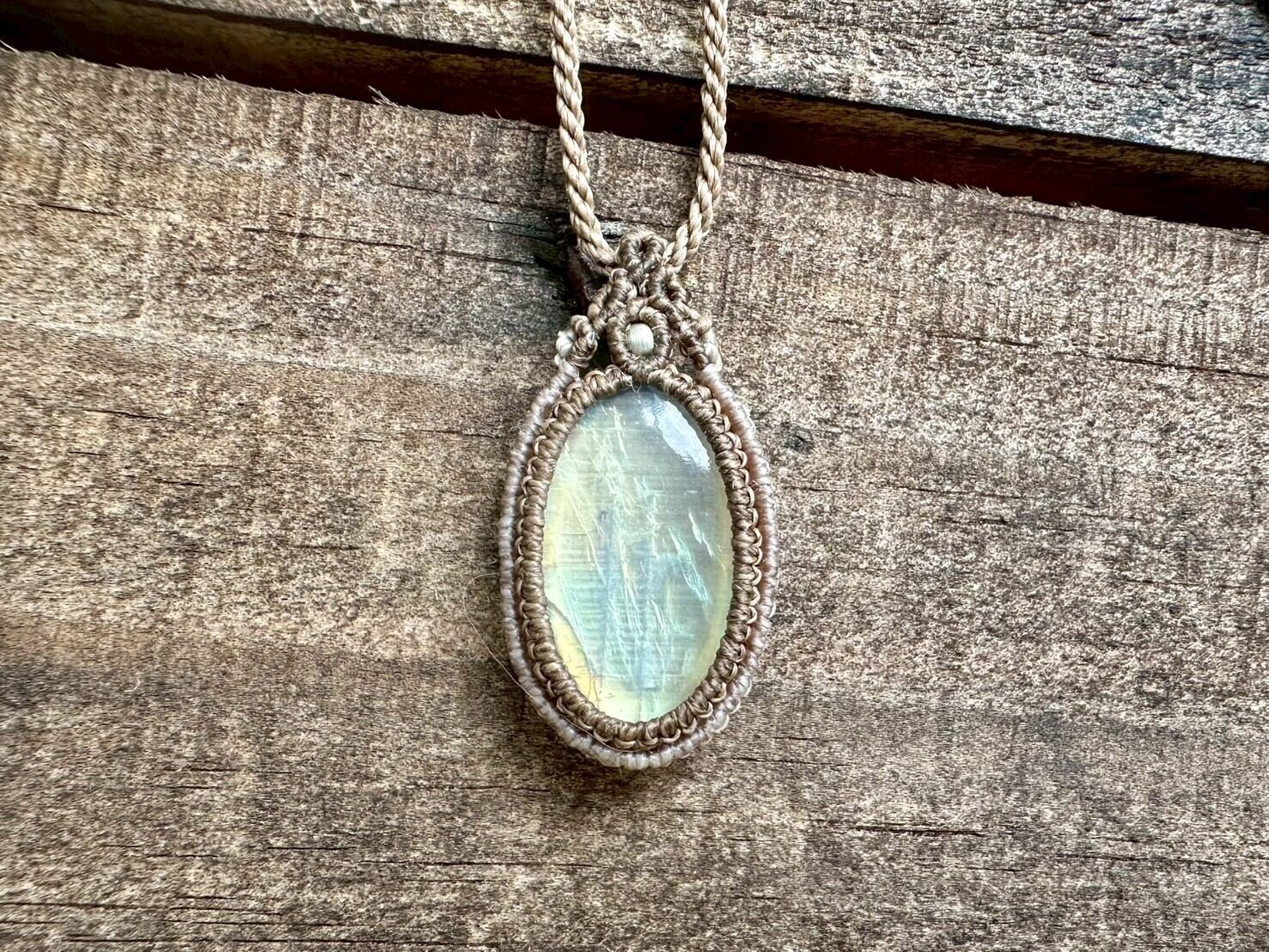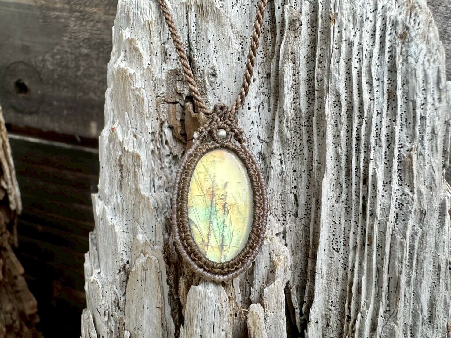光の角度によって青や緑、金色のようにも見える幻想的なシラーが美しい、レインボームーンストーンのマクラメネックレスです。