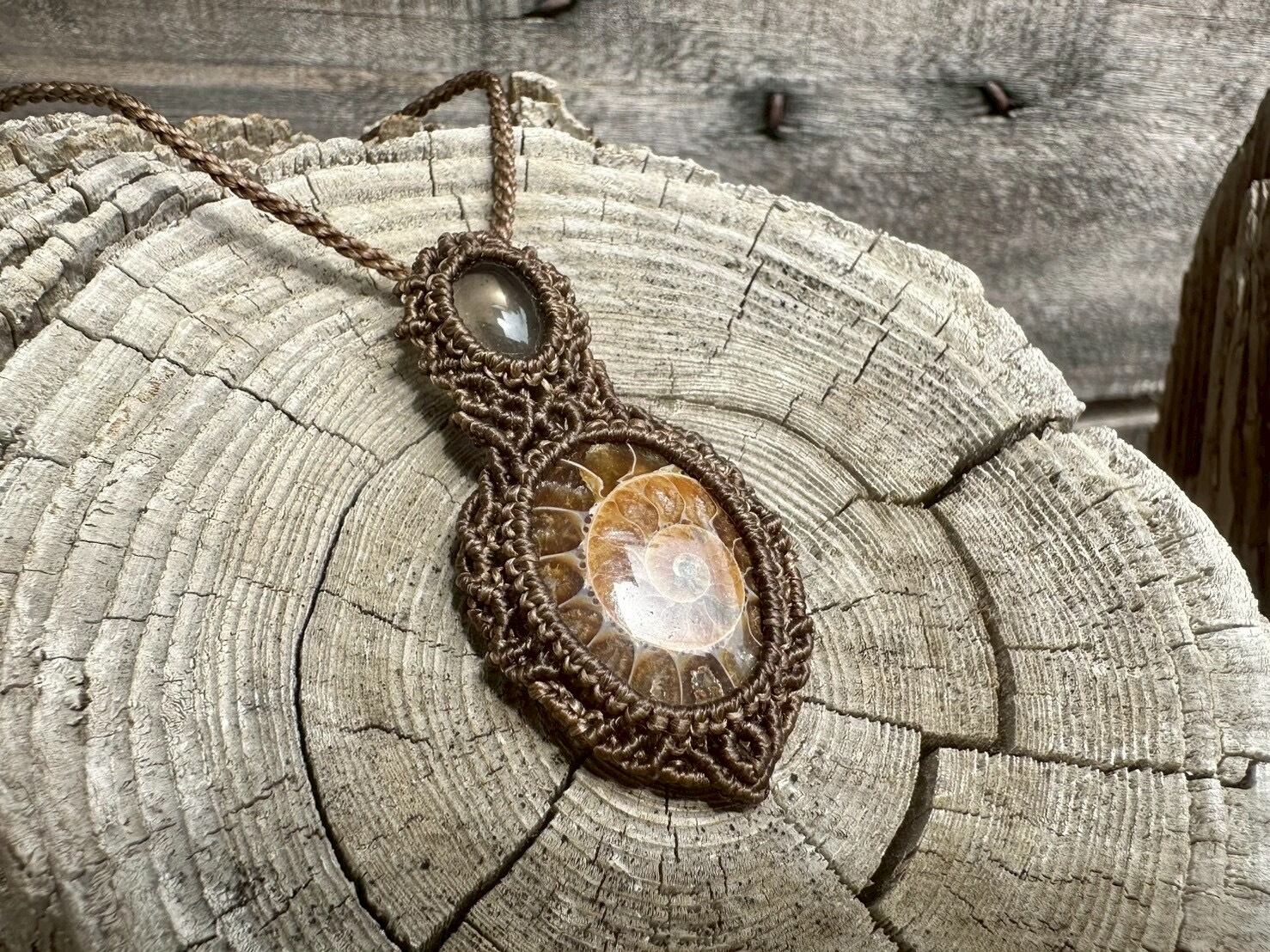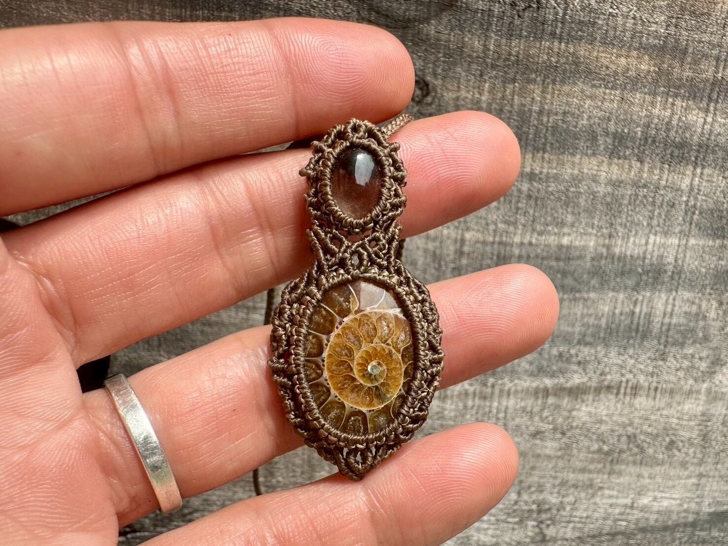 その化石に、深いブラウンのスモーキークォーツを添えて、