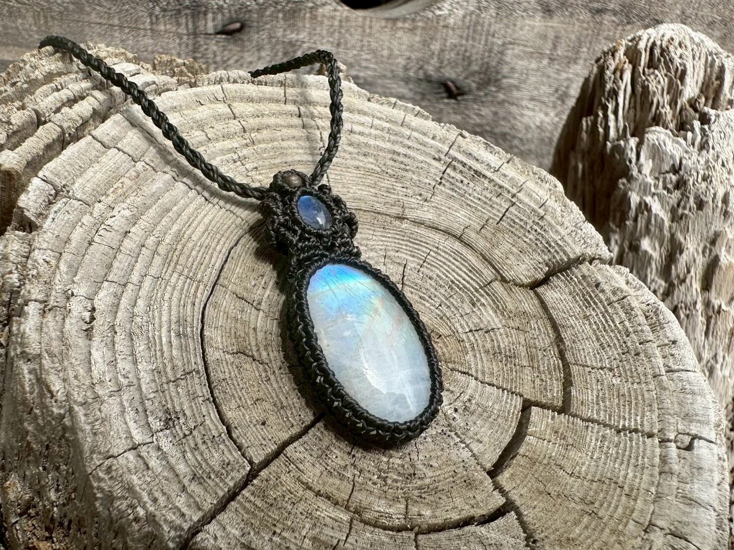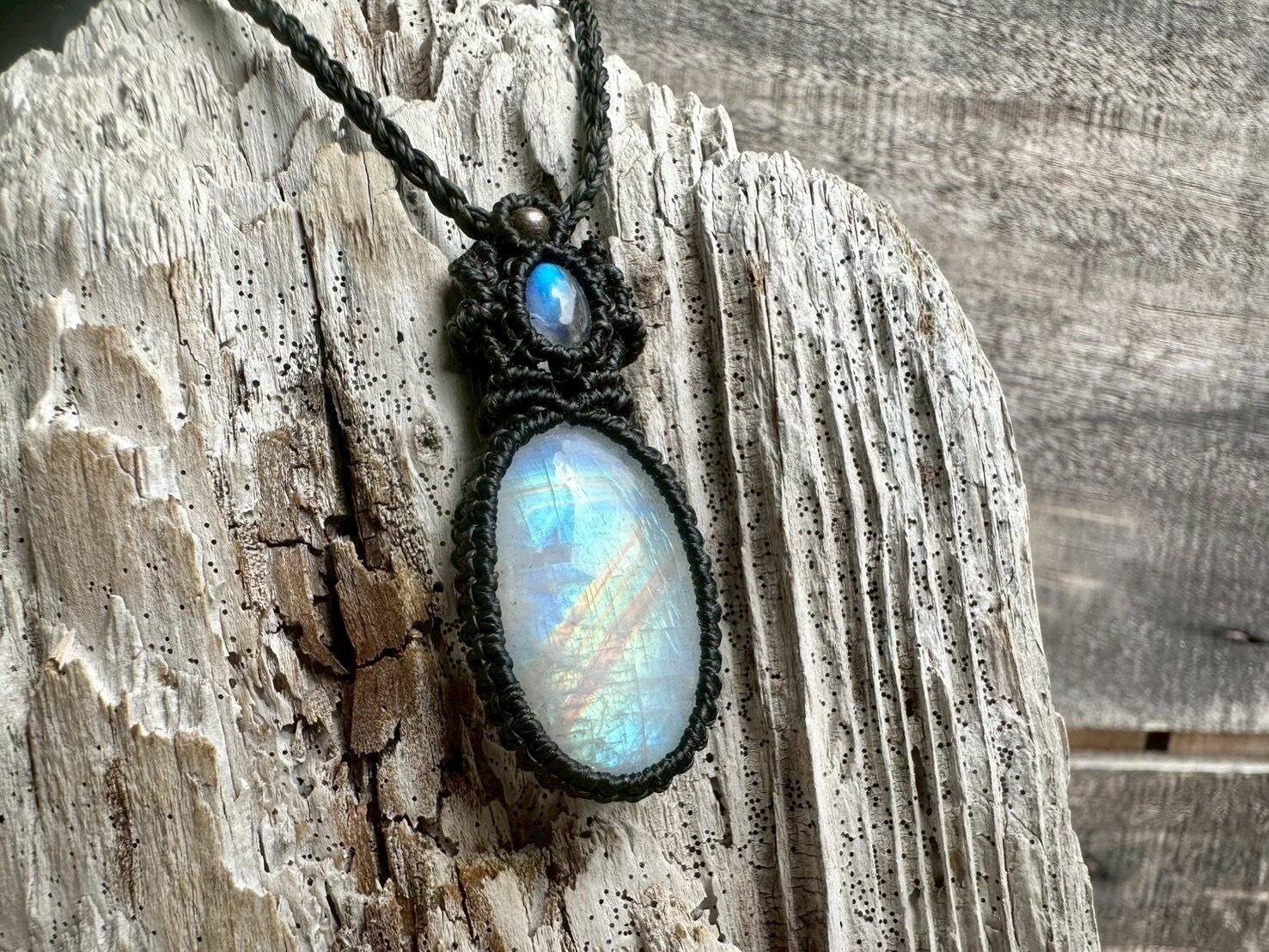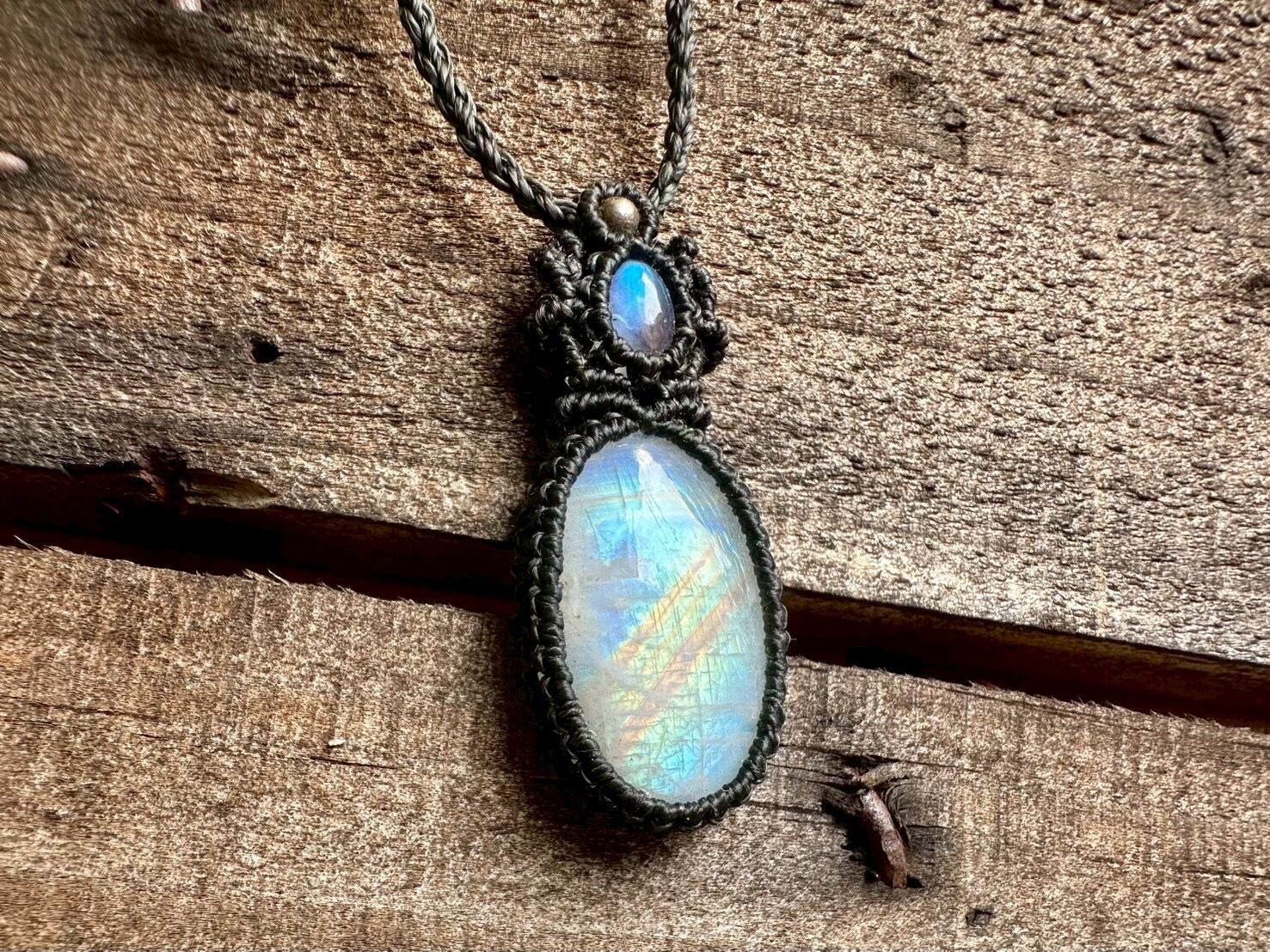 大小2つのレインボームーンストーンを組み合わせて、夜空に寄り添う月のような静けさと神秘を宿した一点もののネックレスに仕立てました。