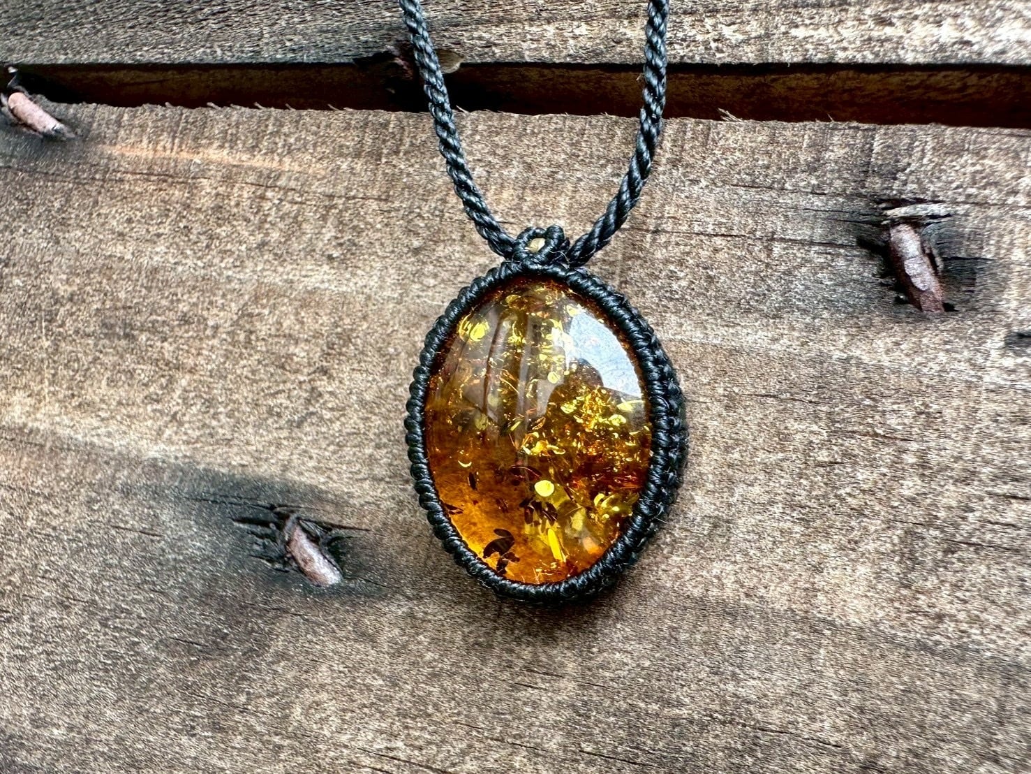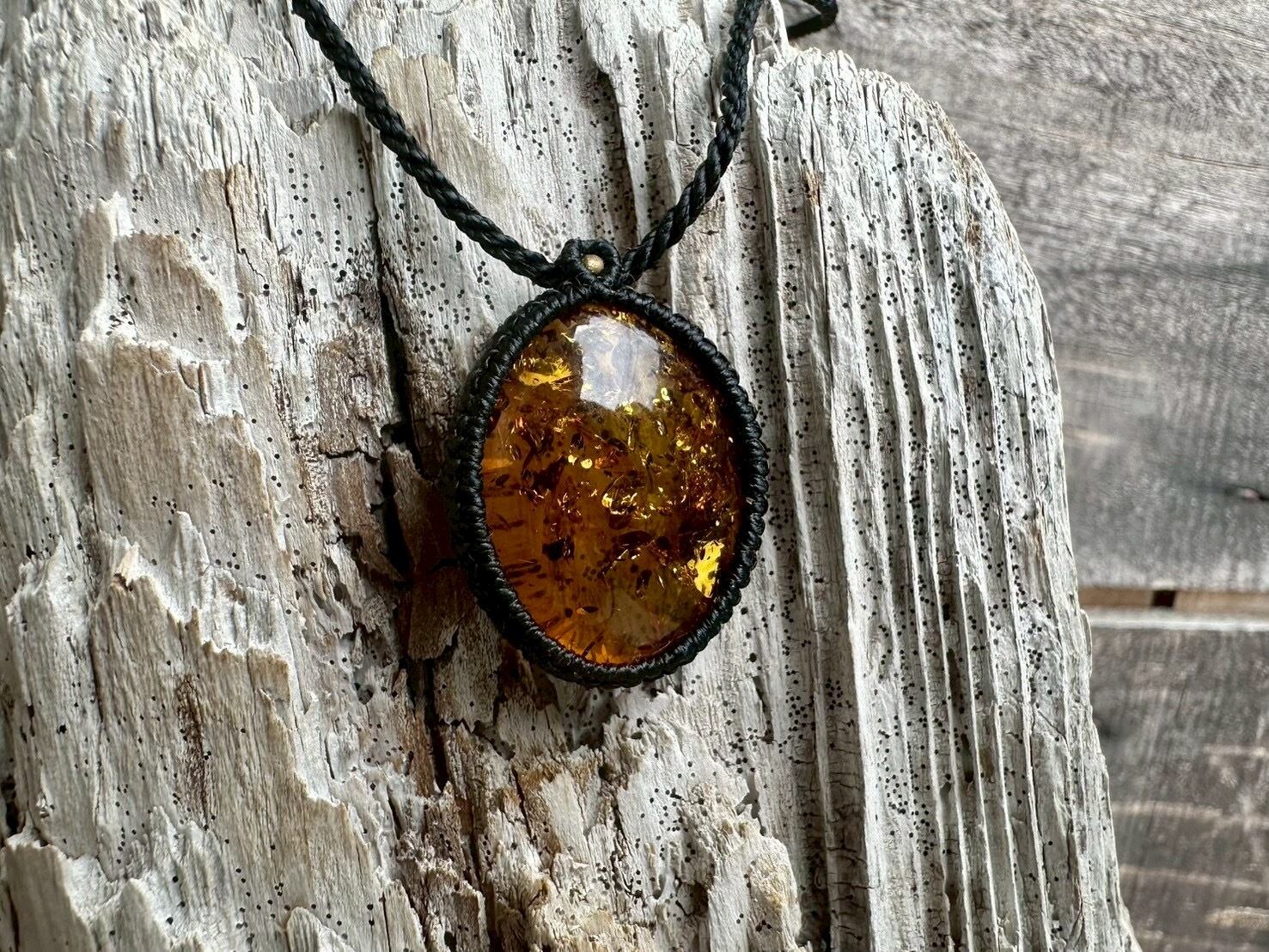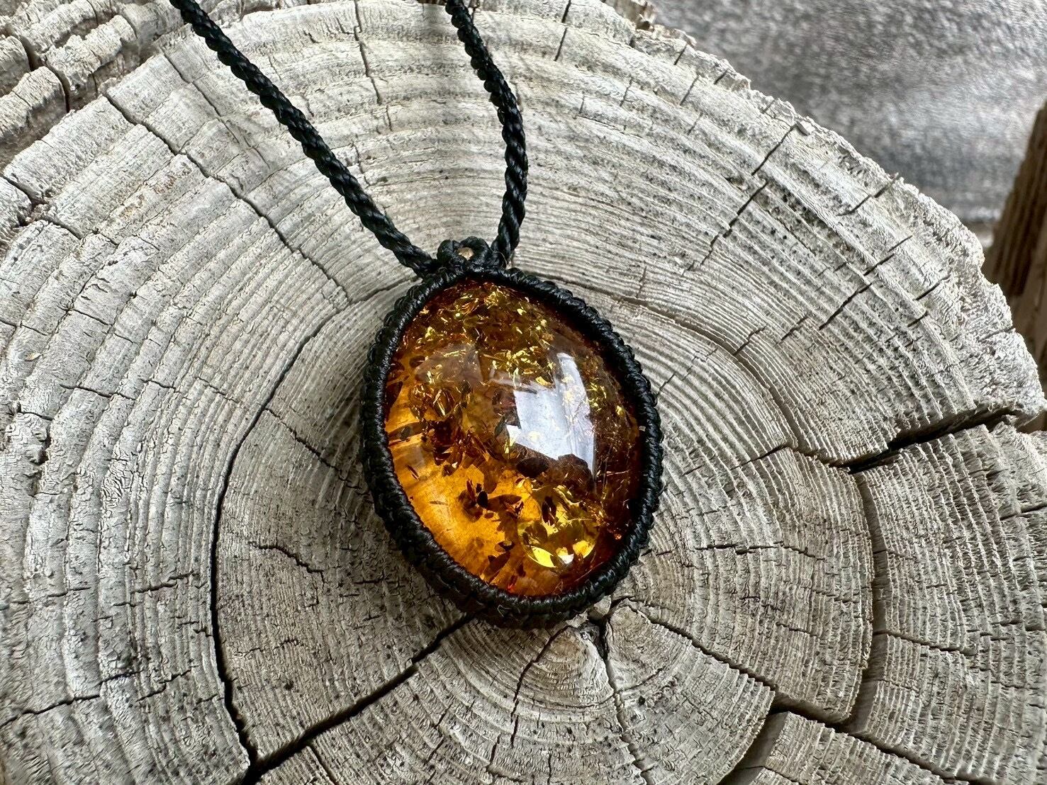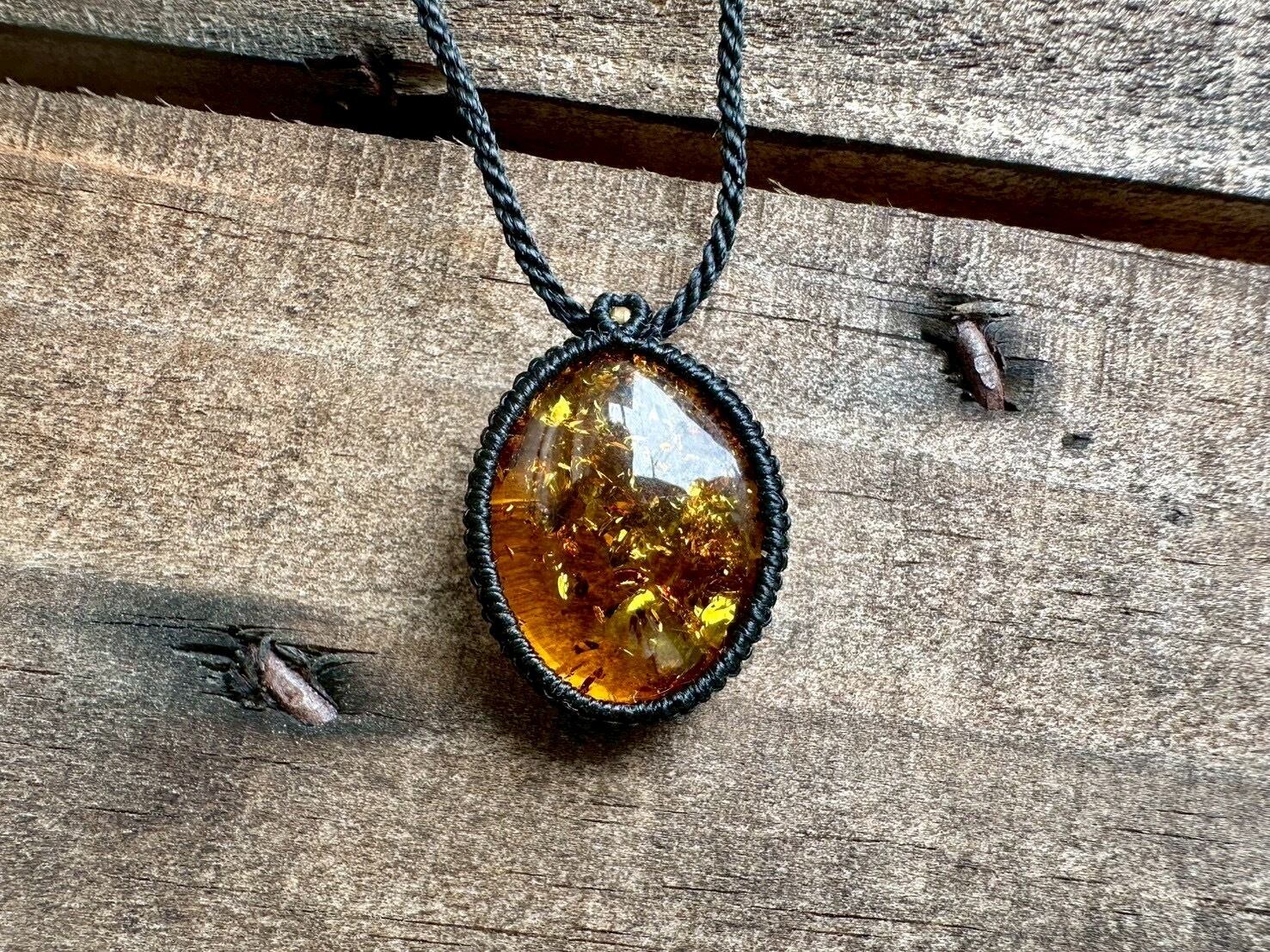 内包物も綺麗で透明感もばっちりのハイクオリティなアンバーを、マクラメ編みで包み込み、唯一無二のネックレスに仕立てました。